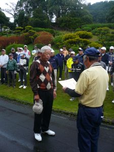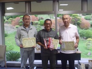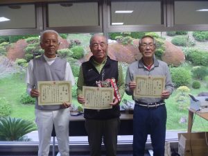 OUT優勝は、南毛利南地区坊中老寿会の渡邉英夫さん、IN優勝は、小鮎地区南部幸寿会の見留治夫さんが授与されました。